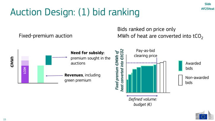 Bei der Heat Auction handelt es sich um ein EU-weites wettbewerbliches Verfahren. Einziges Förderkriterium ist die Fördereffizienz in € je nicht emittierter Tonne CO2-Äquivalent. Der Gebotspreis, in € / produzierter MWh Wärme bzw. € / eingesparter Tonne CO2 kann selbst gewählt werden. Sowohl steigende operative Kosten als auch die Investitionskosten können in einem Gebot berücksichtigt werden. Genaueres entnehmen Sie der nachfolgenden „Drop-Down-Liste“.