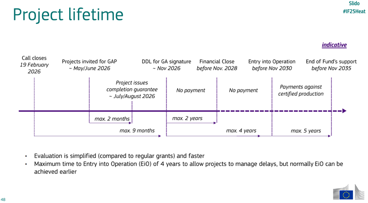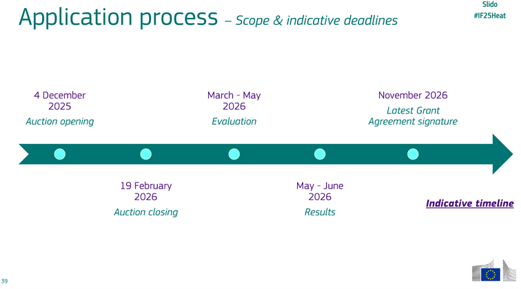 Das Verfahren wurde am 04.12.2025 geöffnet und wird am 19. Februar 2026 geschlossen. Die Evaluierung findet zwischen März und April 2026 statt. Zwischen Mai und Juni werden die Ergebnisse der Heat Auction verkündet. Die Unterzeichnung des etwaigen Grant Agreements würde im November 2026 erfolgen.