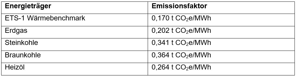 Für die Berechnung der Emissionsminderung sind vom Fördergeber vorgegebene Emissionsfaktoren zu verwenden. Der Emissionsfaktor des Heat Benchmarks (EU-ETS 1) ist als „Default“ eingegeben. Es können auch andere Emissionsfaktoren verwendet werden (Steinkohle, Braunkohle, Heizöl, Erdgas), insofern die derzeitig installierten Aggregate außer Betrieb genommen werden und vollständig durch elektrifizierte oder geo- bzw. solarthermisch betriebene Aggregate ersetzt werden. Die Emissionsfaktoren sind nachfolgend aufgelistet: